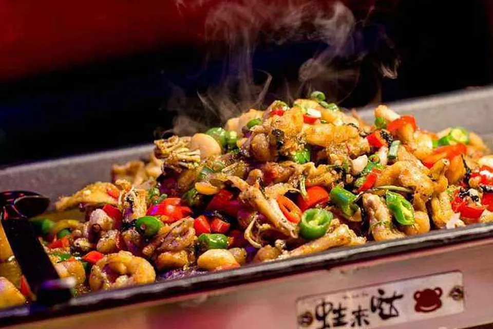 先说说这里的美食,牛蛙锅有很多种口味,可以选平锅,也可以选泡锅。平锅属于炭烧锅,汤汁较少,泡锅汤汁较多,吃完的锅底都可以下火锅。除了蛙锅外,店里还吸纳了各地的特色美食,有炭烤排骨、黑糖糍粑等,品种非常多,真的让我大开眼界,仿佛来到了美食天堂。