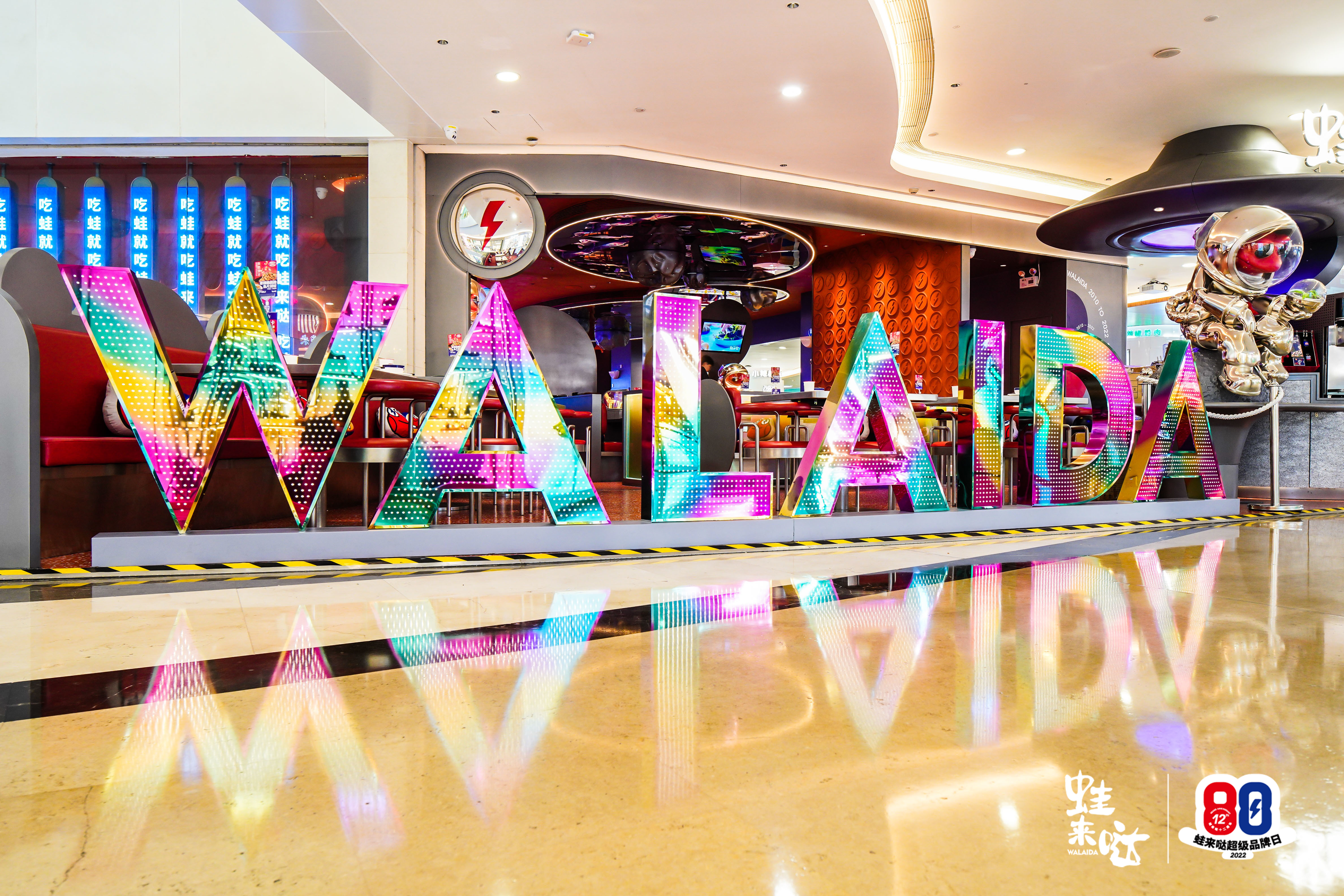 以深圳的皇庭广场蛙来哒快闪店为例,无论是外观还是店铺内饰,无一不透露着“紧急下班,踩点冲蛙”的品牌日主题,并且今年也是蛙来哒成立的第十二周年,数字“12”也能让蛙粉们感受到陪伴蛙来哒创立到发展至今的历程。店门口贴心的布置了专门的拍照打卡区,带话题发布小红书即可获得打工人必备解压球。再发朋友圈、微博、大众点评等社交平台,还有送小风扇、杯子等周边。