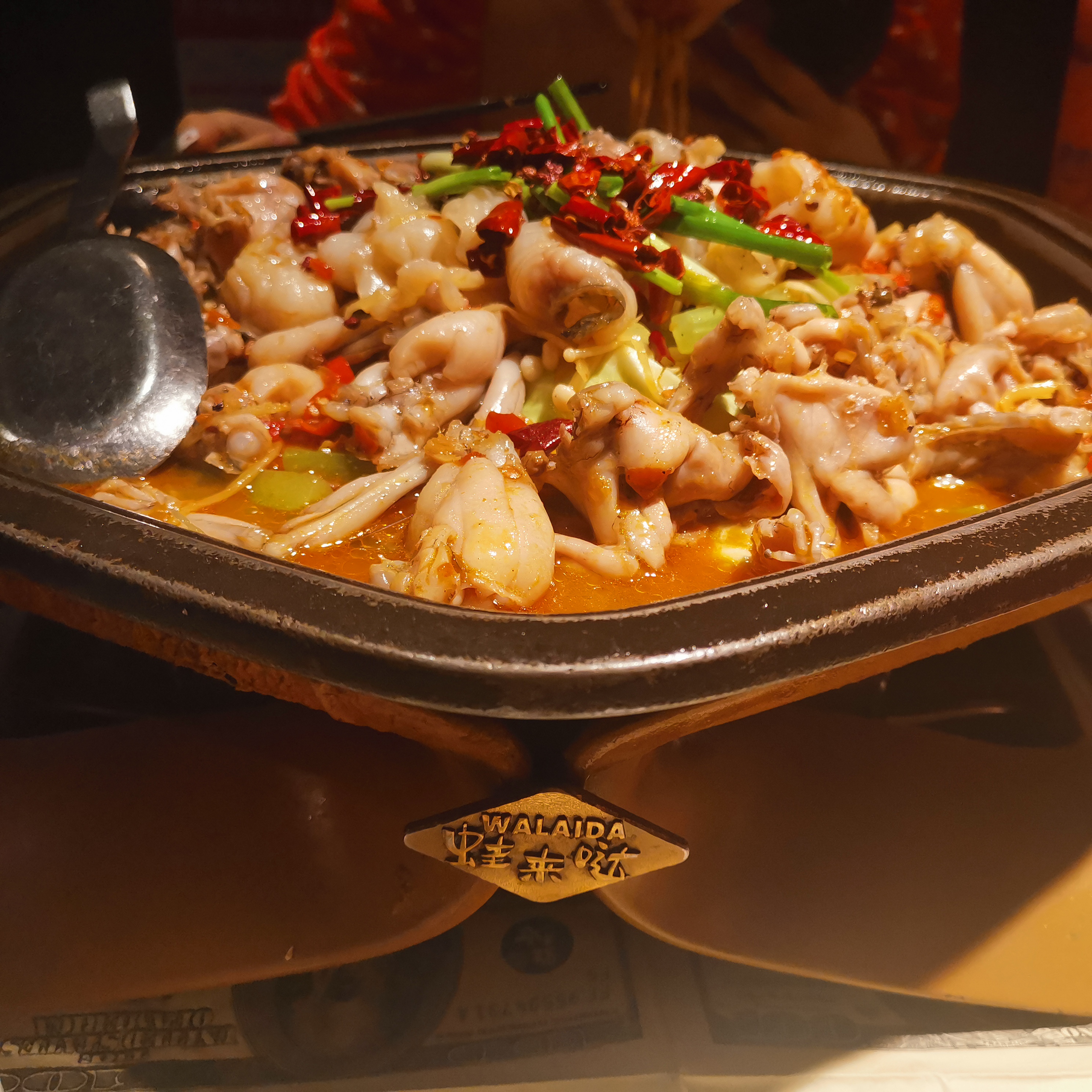 饿了一天,我迫不及待地点了一锅色香味俱全的“香辣脆脆脆鱼片拼蛙”,上面撒着辣椒段和花椒,吃起来又麻又辣,蛙肉还是跟以前一样又嫩又香,吸满了浓郁的汤汁,脆肉皖非常新鲜,搭配着锅内的金针菇特别下饭。
