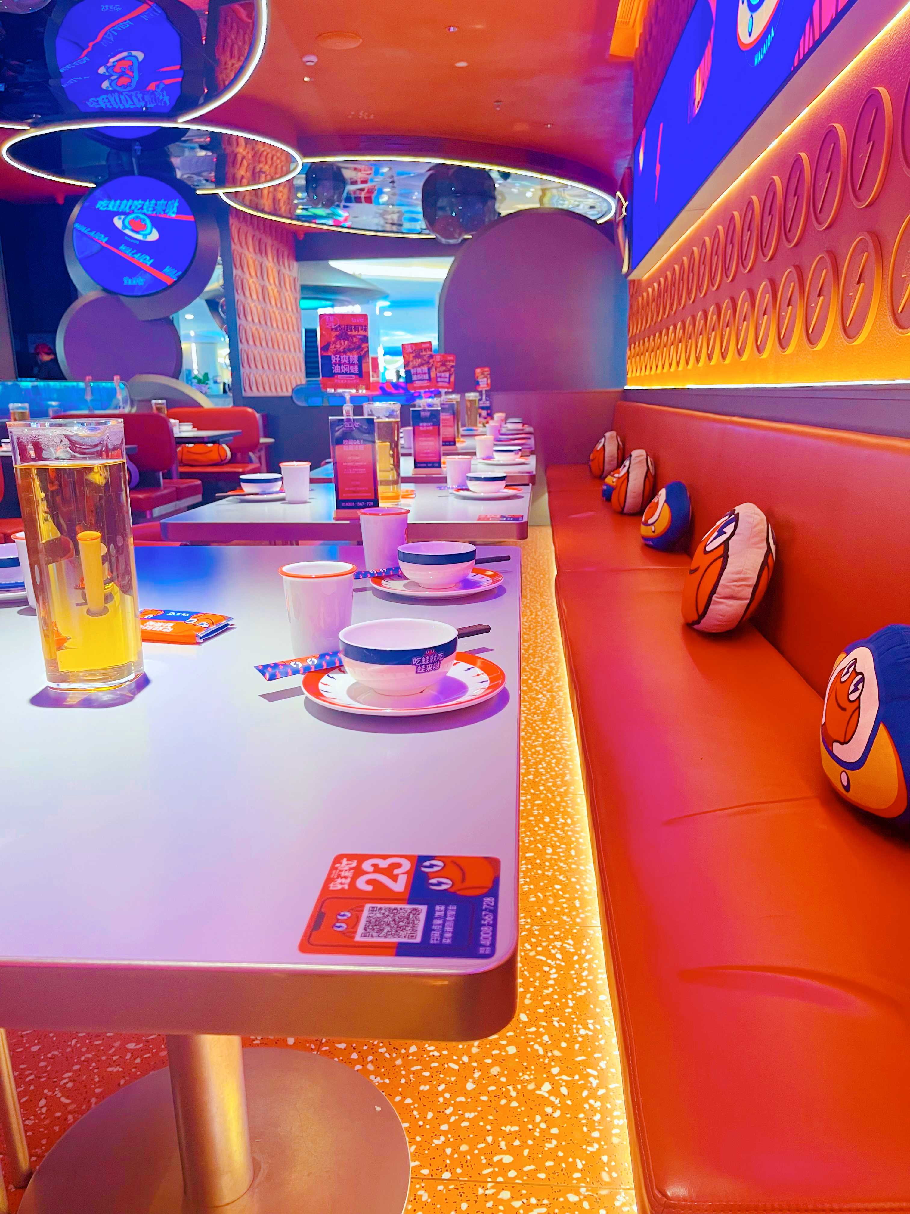 作为牛蛙美食界的扛把子,在门店装修风格方面,蛙来哒完全迎合当下年轻人的喜好,打造出时尚、潮流的氛围感,两大视觉冲击效果突出的红色与蓝色调搭配,营造出更刺激的视觉效果,把这两种风格鲜明的颜色搭在一起,给人独特的视觉感受,这种符合年轻人口味的设计理念和装修风格,完全直击消费者内心,以高颜值店面成为城市一道亮丽的网红打卡点。