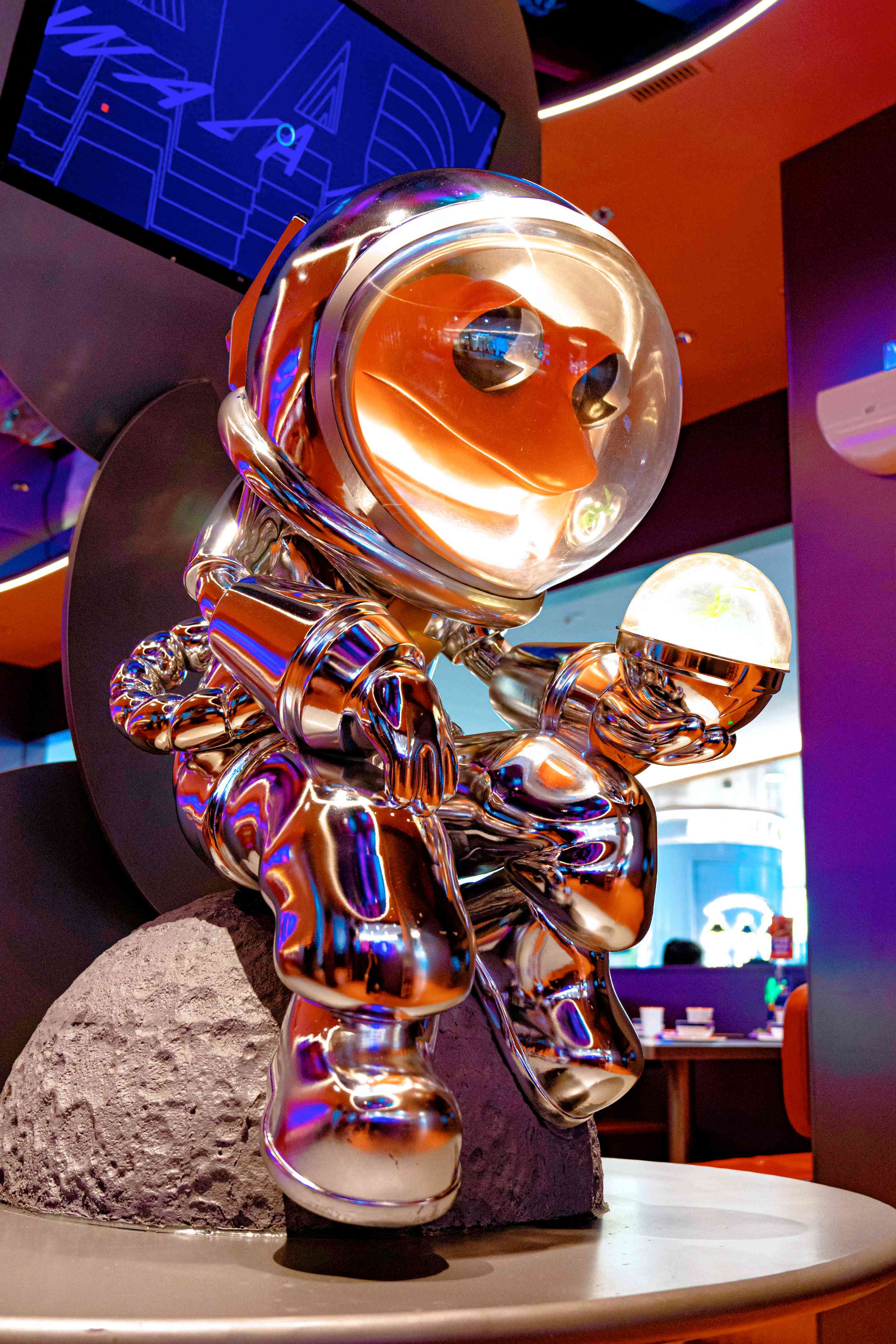 此次品牌升级里最亮眼的要数太空人雕塑,以及店内随处可见的科技太空元素。
